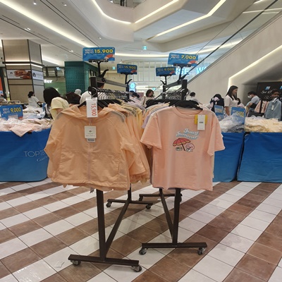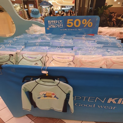 스타필드시티 위례점 지하1층 탑텐키즈에서 유아 여름옷 할인행사를 하고 있습니다.