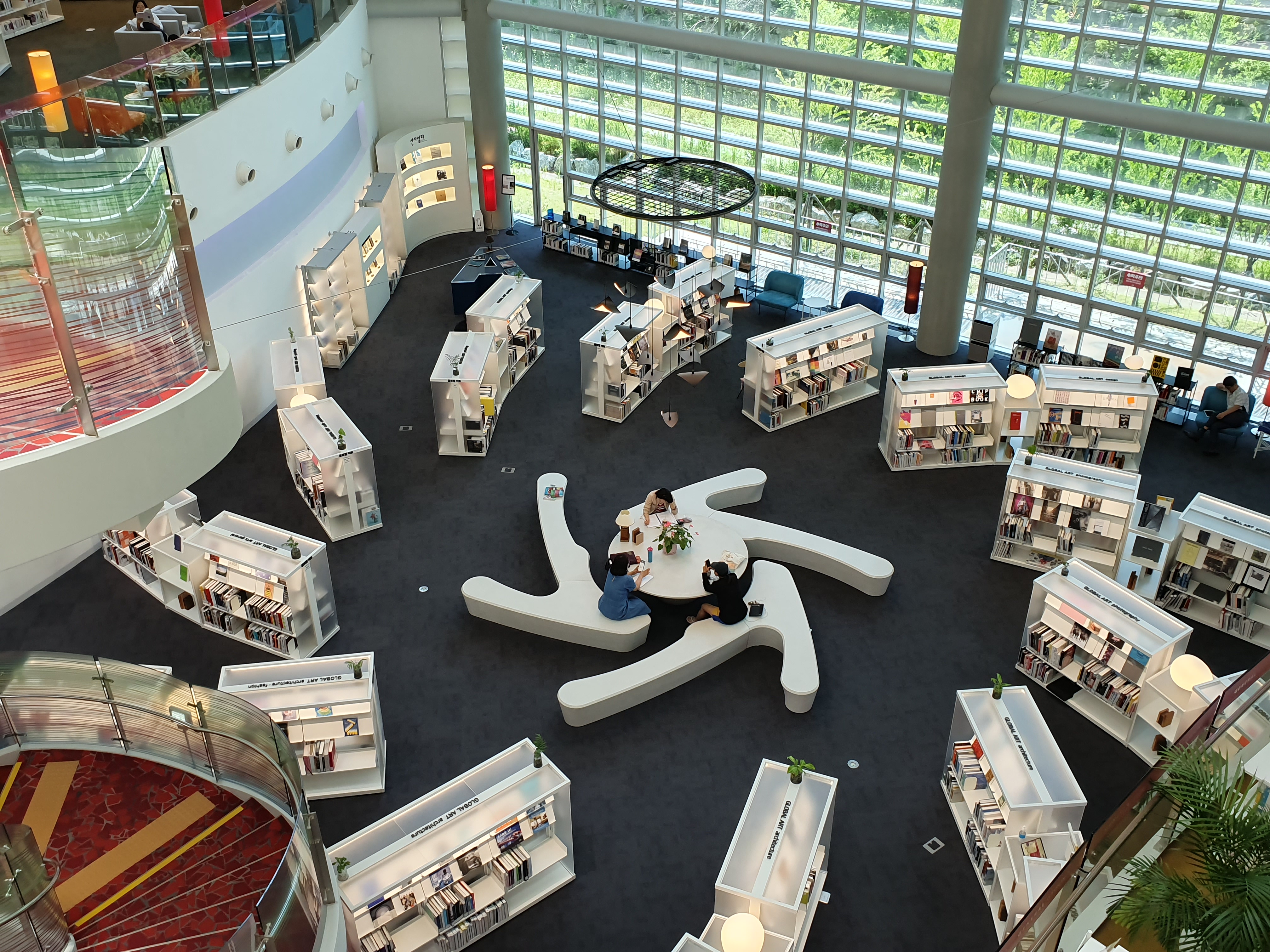 유리로 된 2층 난간에는 책장과 화초가 놓여 있는데, 이것이 아이들의 추락사를 방지하고 예방할 좋은 생각이라고 봅니다. 실제로 가 보면 사람의 관심이 책으로 가게 되거나 몸이 다른 곳을 향하게 되어 신기했답니다. 그리고 책장과 화초가 도서관의 분위기를 편안하게 만드는 데 한 몫 하는 장점도 되네요. 하지만 어린이들은 안전사고 예방을 위하여 부모님들의 각별한 주의가 필요하다고 봅니다.