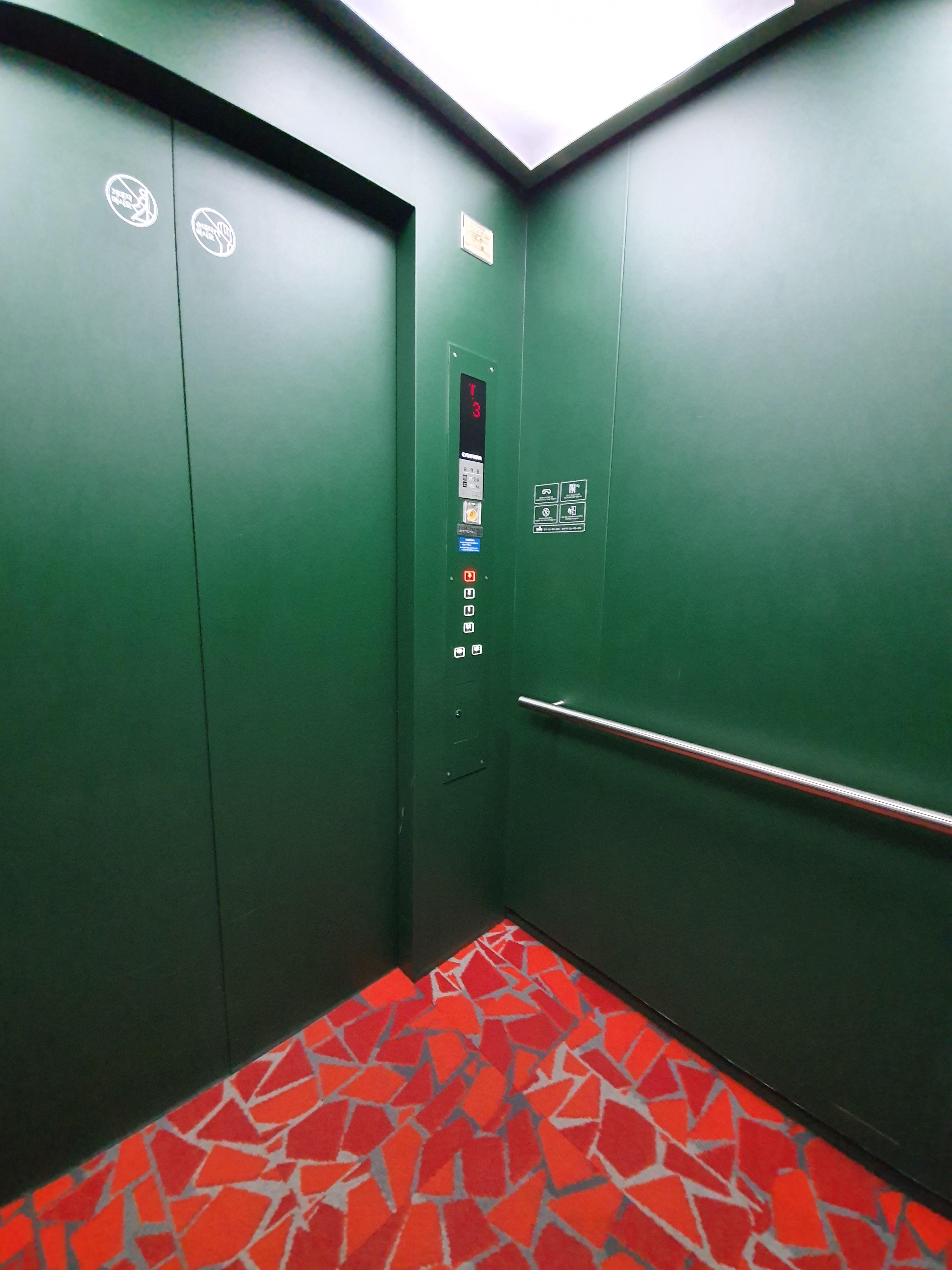 의정부미술도서관은 미술도서관이라서 그런지 엘리베이터 안에도 특징이 있었습니다. 녹색과 빨강! 서로 대조적인 색상의 배치가 매우 강렬한 인상을 주었습니다. 그리고 엘리베이터 바닥에 카페트가 깔려 있어서 폭신폭신한 촉감이 매우 기분 좋았습니다.