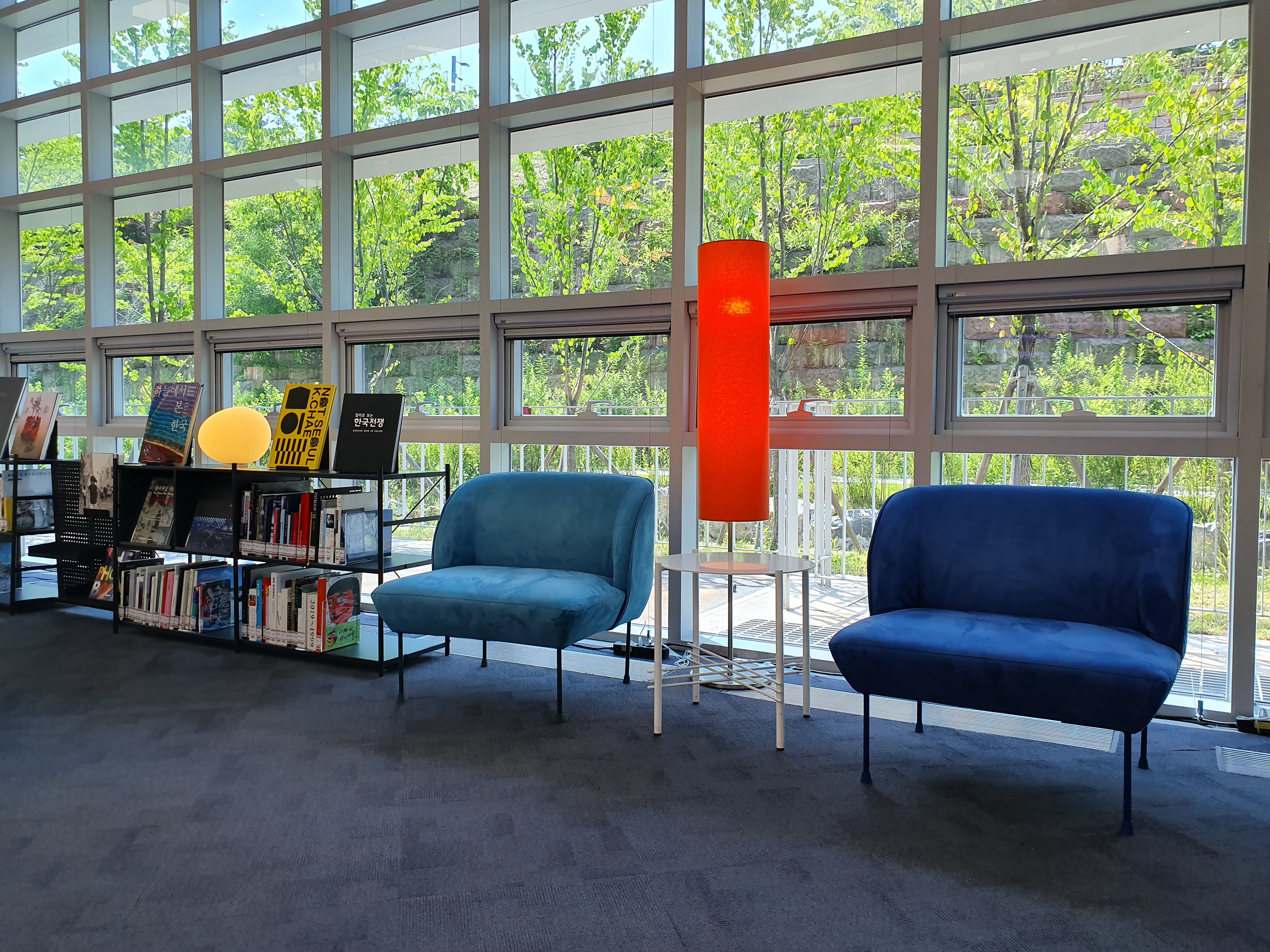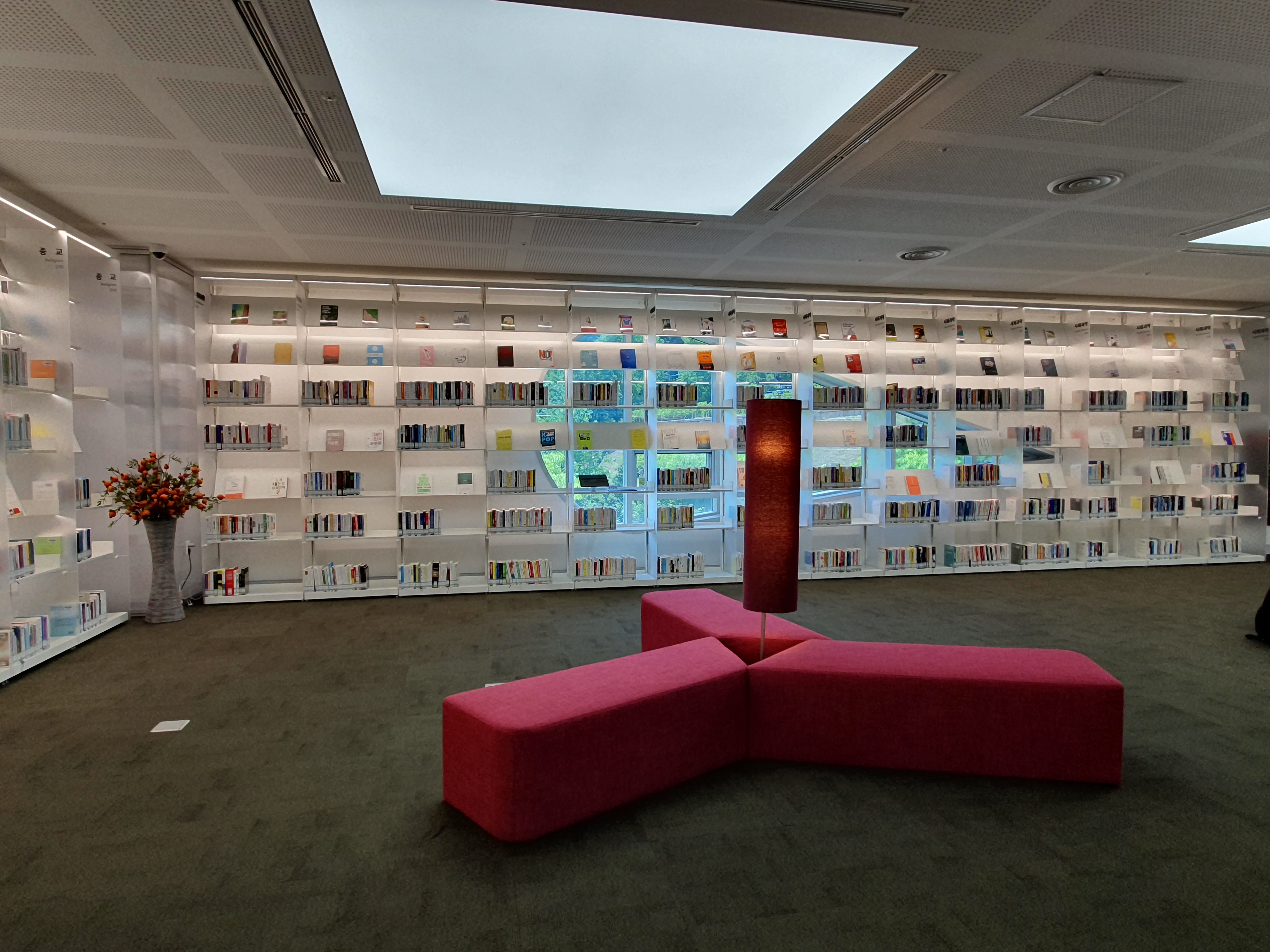 이곳은 어른들을 위한 일반자료실입니다. 삼각형 모양의 소파, 붉은색 스탠드, 창문의 독특한 모양과 밝은 햇살 등이 세련된 느낌을 줍니다.