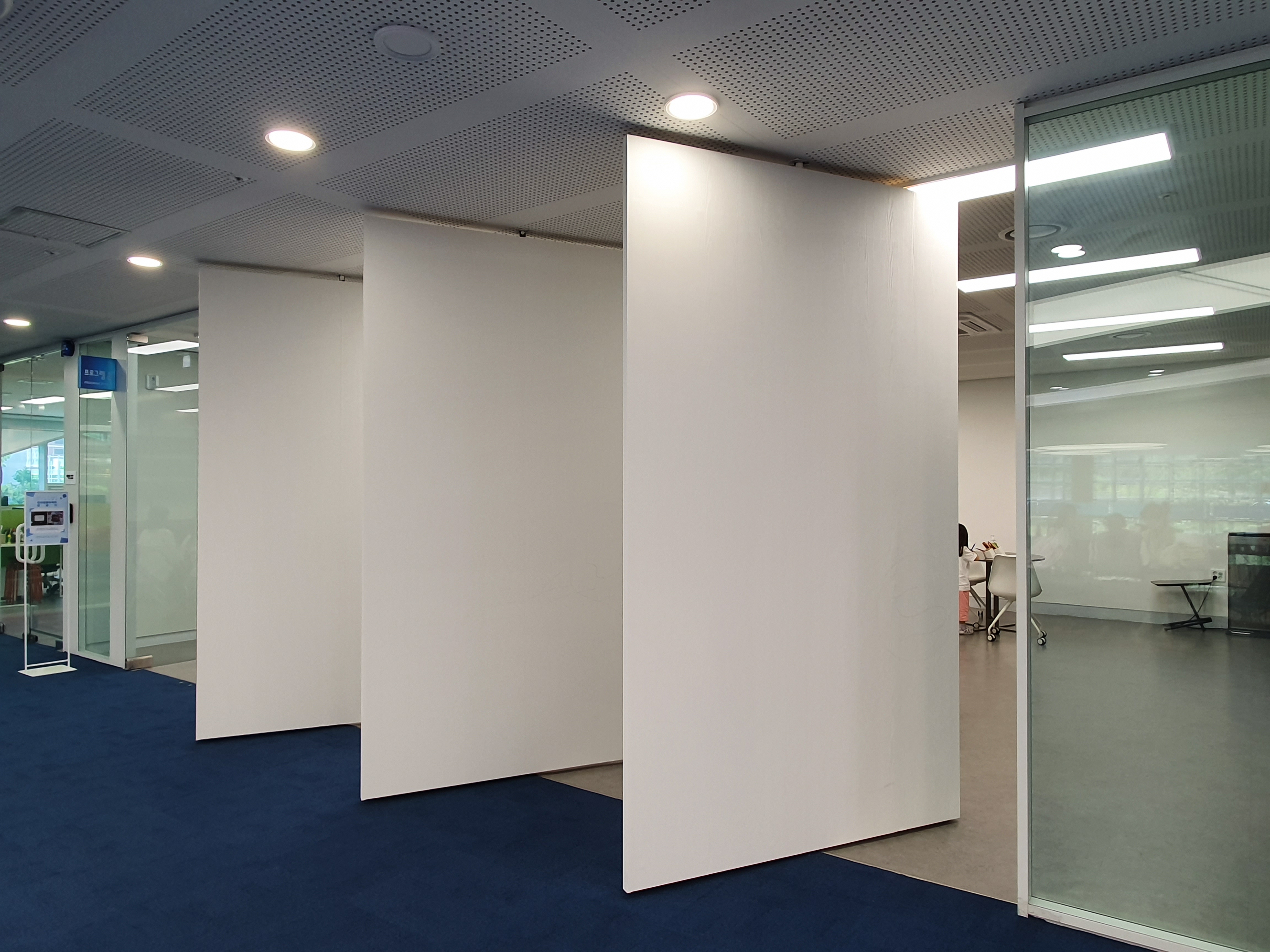 의정부미술도서관의 또다른 특징은 재미있는 아이디어가 너무 많다는 것입니다. 프로그램존의 벽을 보세요. 회전문처럼 돌아가서 상황에 따라 벽의 방향을 바꿀 수 있으니깐 분위기를 새롭게 연출할 수 있고, 문에 대한 고정관념도 바꿀 수 있어서 재미있습니다.