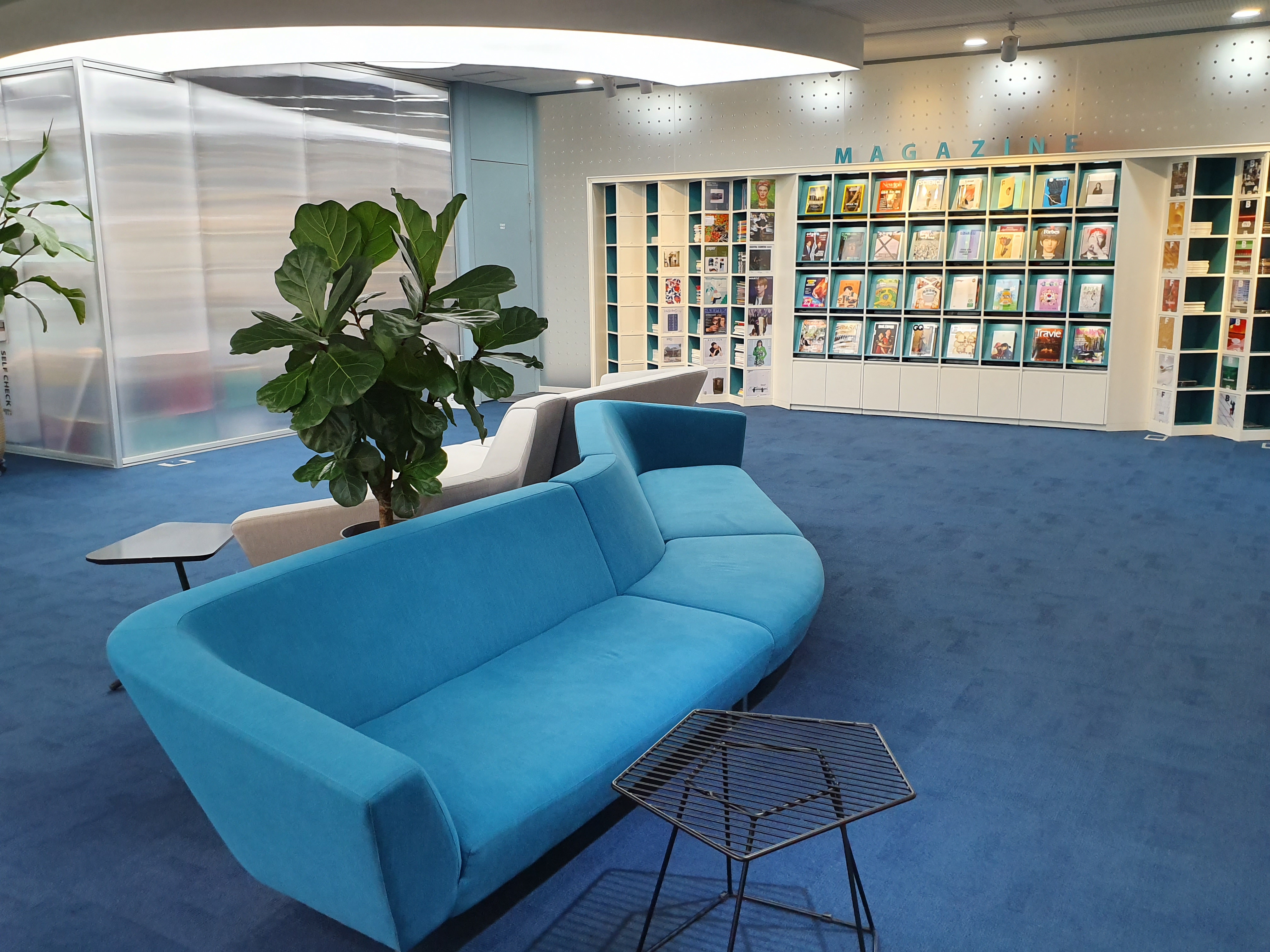 2층의 반은 아이들용, 나머지 반은 어른들용 공간입니다. 두 공간의 가운데에는 다양한 잡지가 비치된 매거진존이 있습니다. 소파의 디자인과 색깔, 테이블의 모양까지 멋있게 구성되어 있습니다.