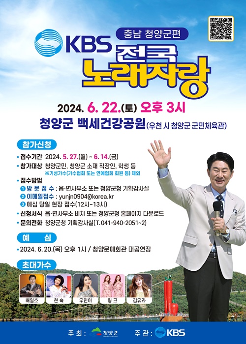 KBS 전국노래자랑 청양 군에서 펼쳐지는 열띤 무대에 많은 관심과 성원 부탁드리며,
