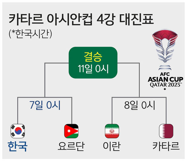 7일 오전 0시(한국 시간), 카타르 알라이얀의 아흐메드 빈 알리 스타디움에서 요르단과 아시안컵 준결승전을 펼치는 한국 축구대표팀을 응원합니다!